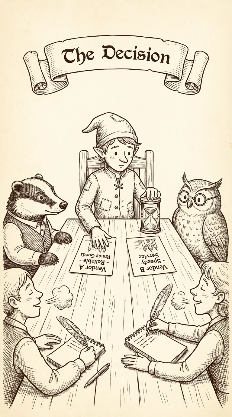 A leader faces two equally good vendors with incomplete information. They set a timer, make the call, name what they gave up — and move the team forward.
