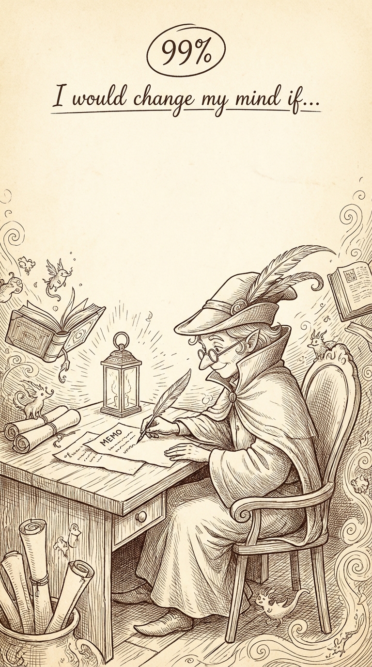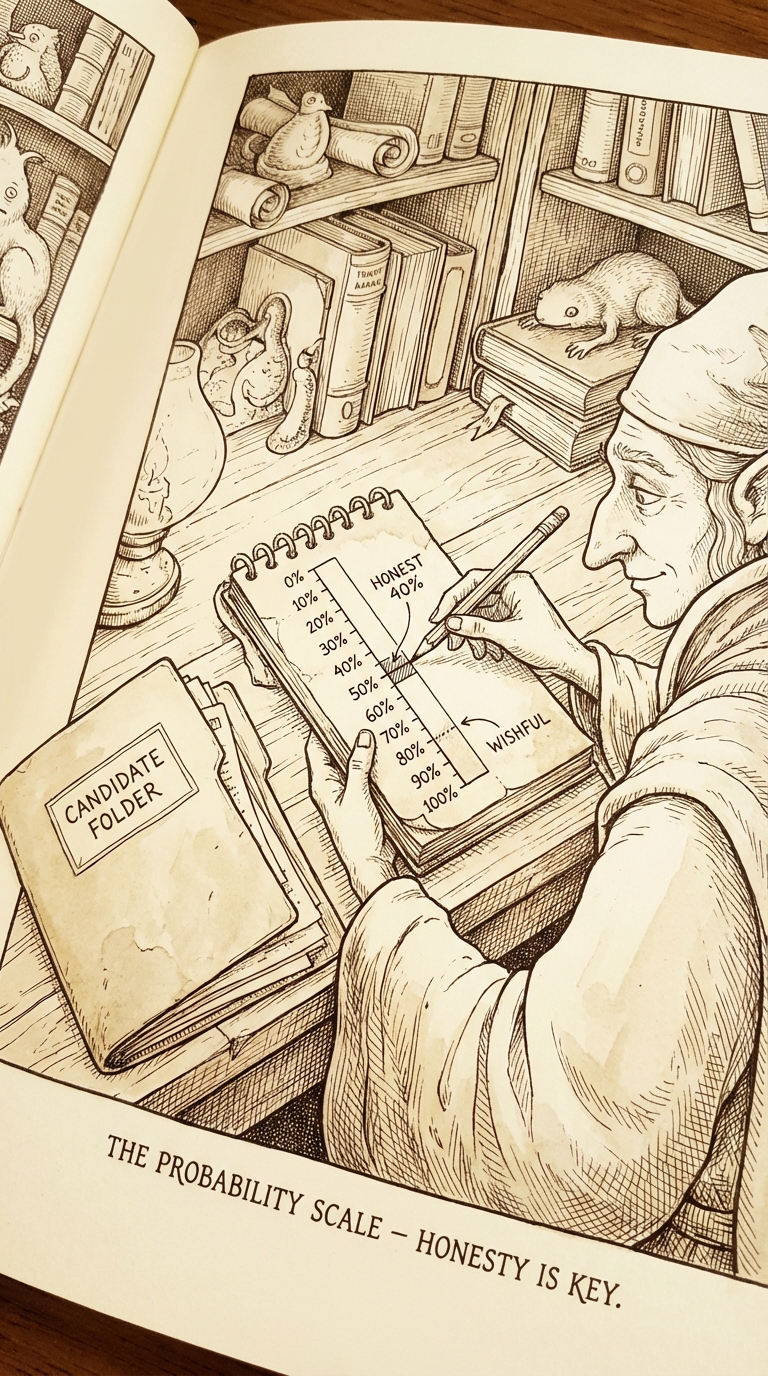 Start with: what's the probability this goes well? Name the number. Then ask: what evidence would change my mind? Write that too.