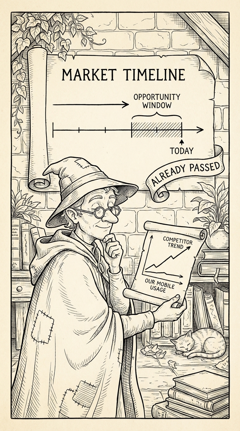 Disconfirming evidence: your analytics show weak mobile demand. Context check: the market moved before mobile apps made sense here.