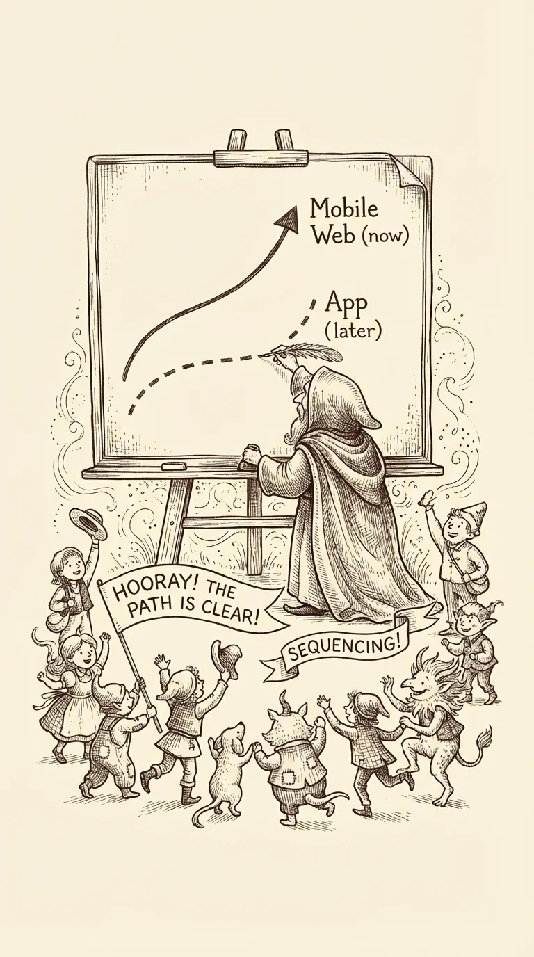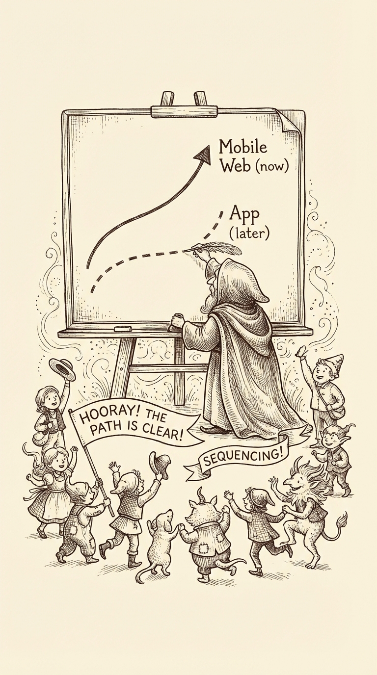 Sequence matters: improve mobile web first. Name what you're NOT doing — not building the app yet — that clarity frees your team to focus.