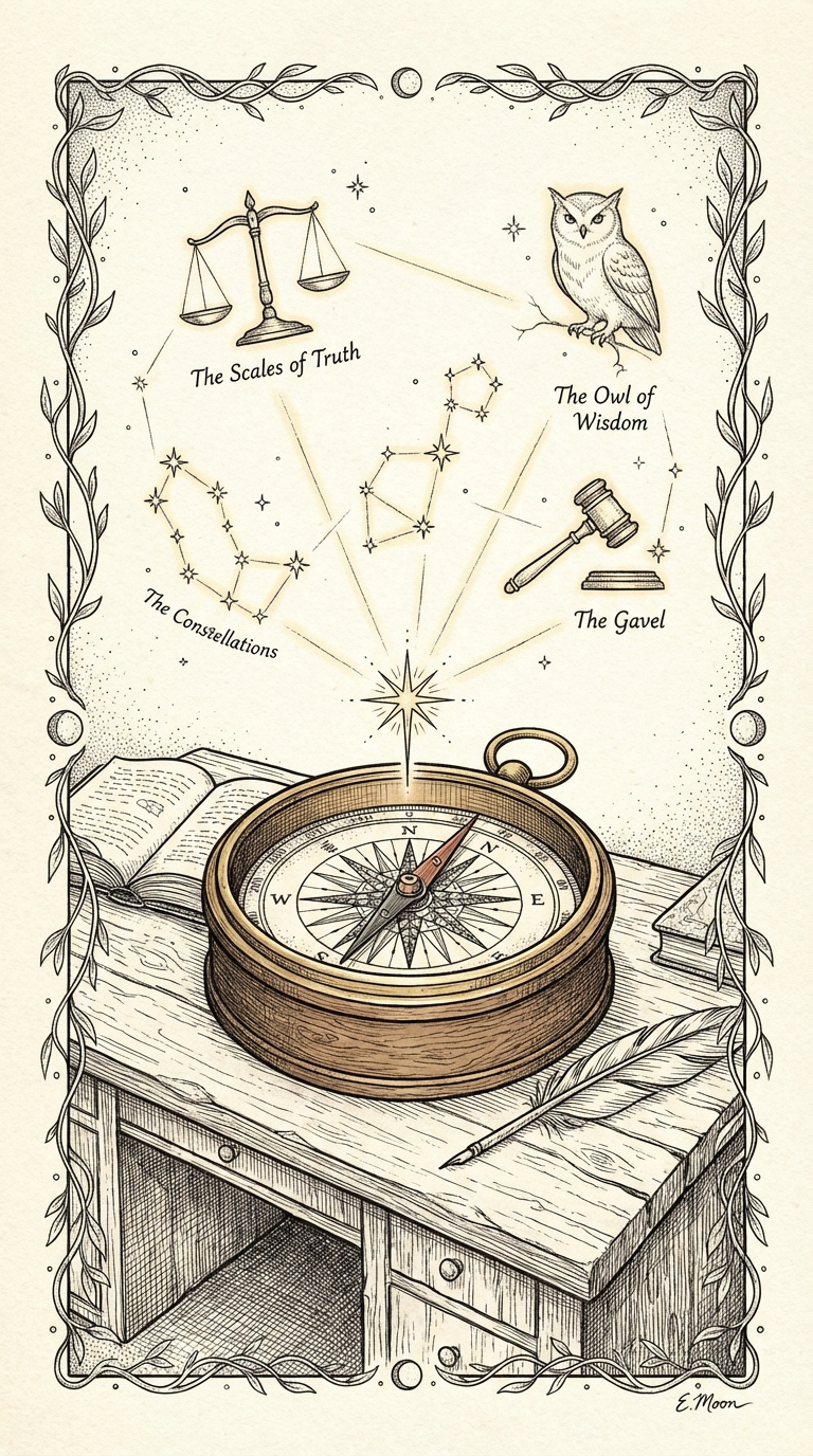 Constellations appear around the compass now — the fixed stars of good judgment, each one a principle mastered and made part of the night sky.
